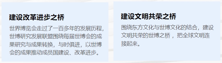 世博国际联盟为了更好地配合中国政府的一带一路工作 ,特成立了一带一路世博桥推进委员会。世博桥就是沟通、理解、友谊的象征。一带一路世博桥推进委员会就是希望同世博成员国一道 ,架起一座友谊、合作的世博之桥。 世博桥的宗旨是推动中国与世博各成员国建设更具全球影响力的全面战略伙伴关系。世博桥具有建造和平、增长、改革、文明等四大桥梁作用;